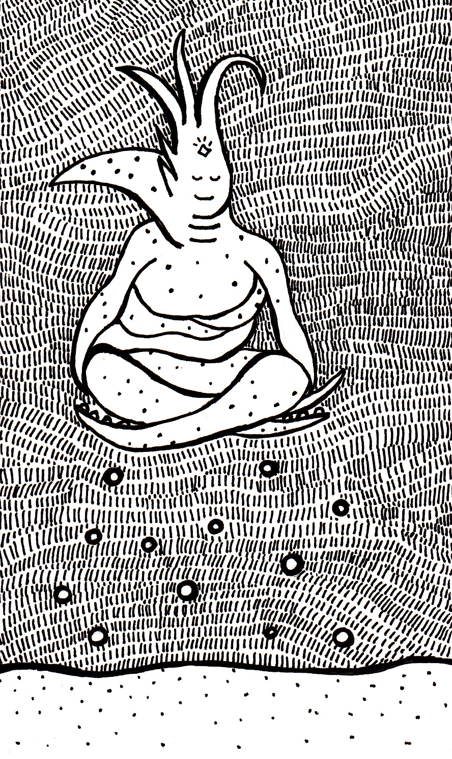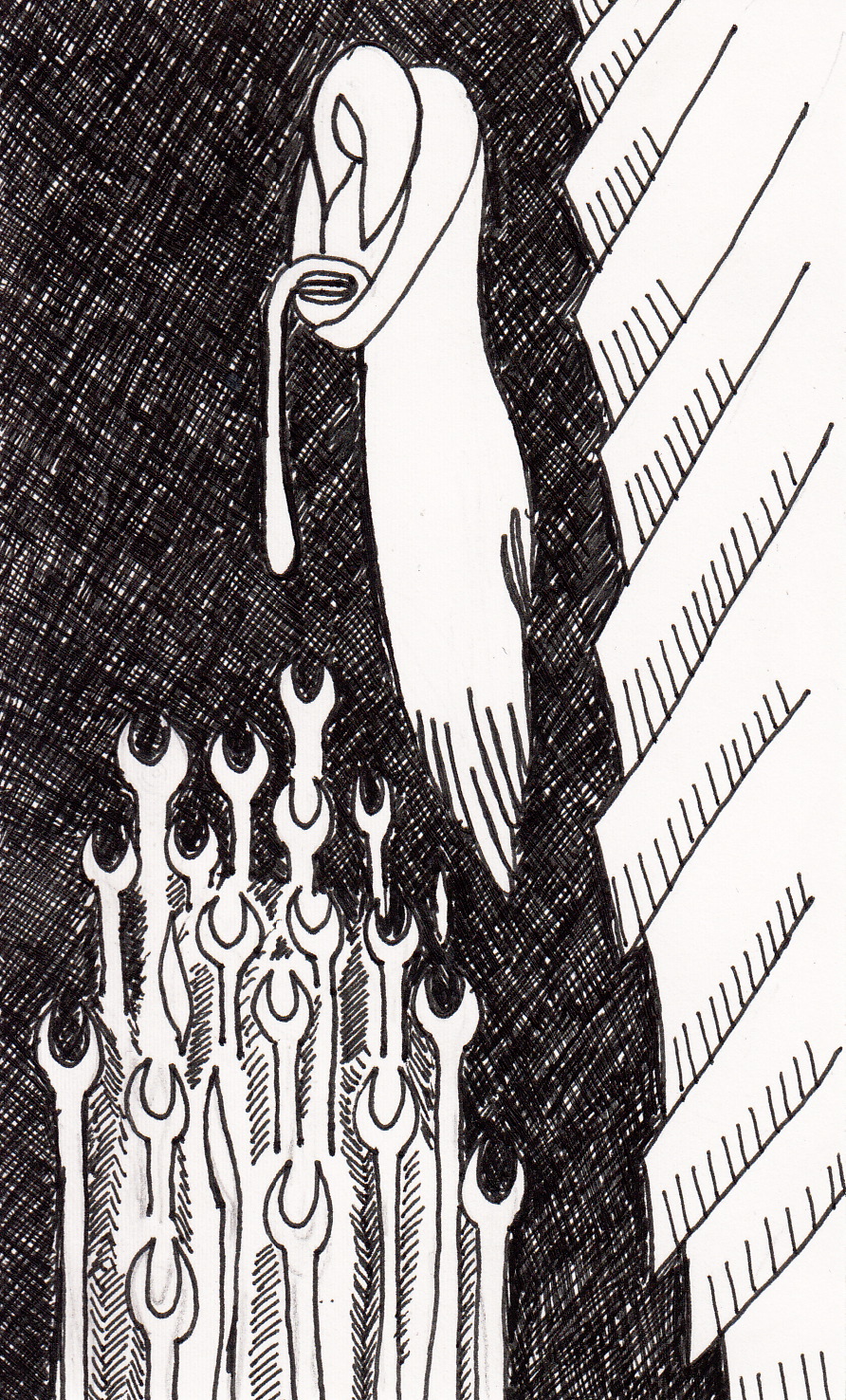 I more or less dreamed of this image (only the things at the bottom had more teeth). A certain Swiss person thinks it looked religious; a certain Vietnamese person decided it was someone holding a toilet bowl above a bunch of really hungry wrenches. Any other ideas?