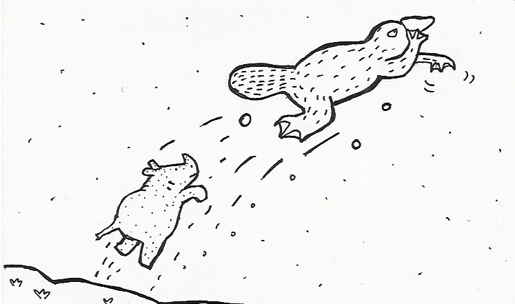 Gosh so I never meant to just leave that story there! To recap, Emily swam into a platypus, which lost its beak in the crash; she took it to her doctorfish friend, but the operation resulted in a rhino head, which it didn’t much like (though as far as I can tell, platypuses are grumpy creatures who really don’t like much of anything). Now the platypus is swimming off in a huff, or trying to, only Emily is a difficult rhino to shake.