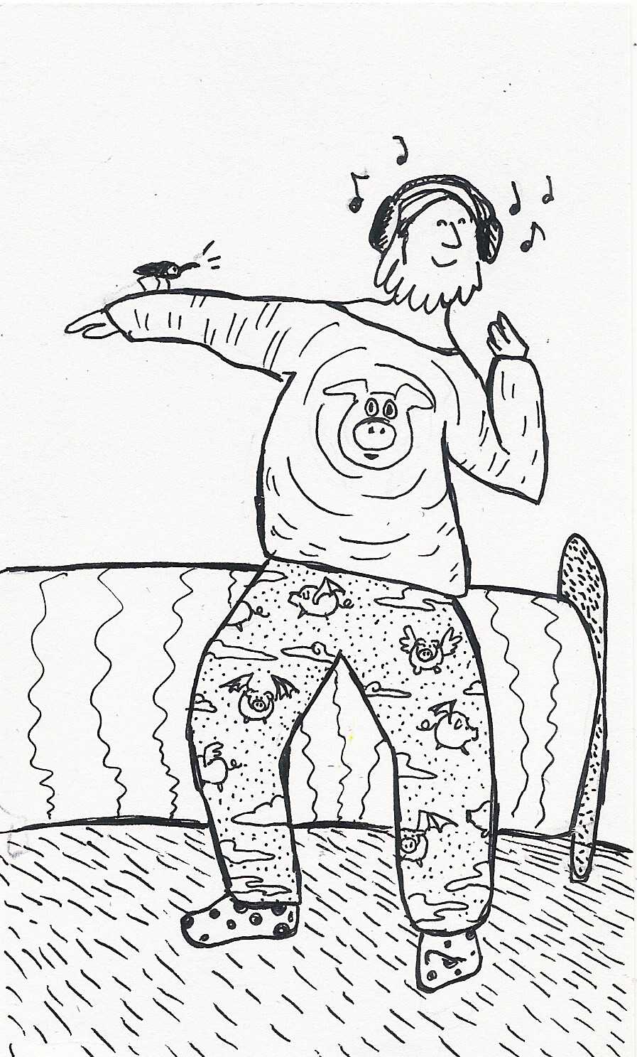 This is my imaginary friend Chris, 42-year-old karate instructor and second guitarist of the local band Weevil Rock You. He would be ecstatic to know actual weevils are trying to talk to him, but alas, headphones. Still, he hasn’t listened to the news either, and has no intention of doing so today -he’d rather just jitterbug in his flying pig pyjamas. I think he’s on to something there.
