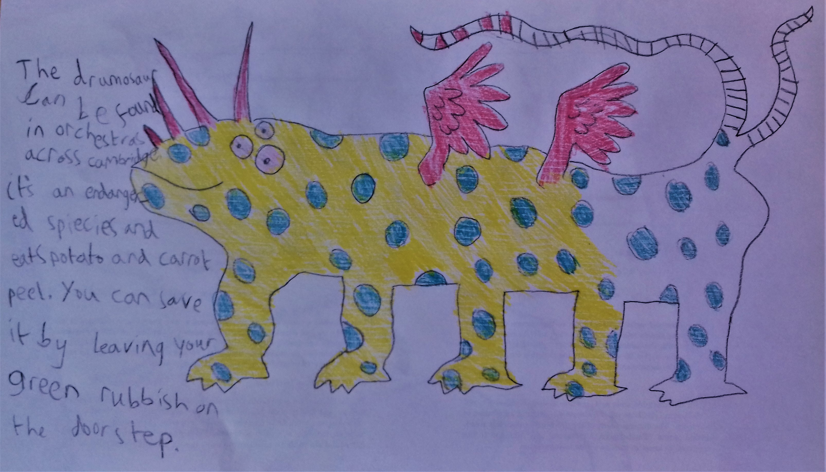 The drummosaur can be found in orchestras across Cambridge. It’s an endangered species and eats potato and carrot peel. You can save it by leaving your green rubbish on the doorstep. -A Small Person